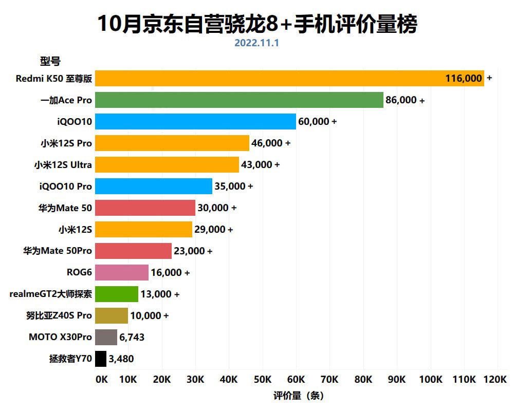 К примеру, на днях известная онлайн-площадка jd.сом поделилась своей статистикой по продажам смартфонов в октябре и ноябре текущего года. Как видно на опубликованных графиках, Redmi K50 Extreme Edition в ноябре месяце стал абсолютным хитом, более чем вдвое опередившим не менее популярный OnePlus Ace Pro.